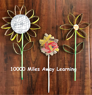 既然紙圈不夠, 媽媽又找來多幾個衛生紙筒, 讓弟弟剪. 之後弟弟又改變主意, 做了一支向日葵. 這是弟弟的另一個創作. 到最後, 紙圈用得差不多了, 時間也有限, 我們就趕快做了原來計畫的六片花瓣的黃花.